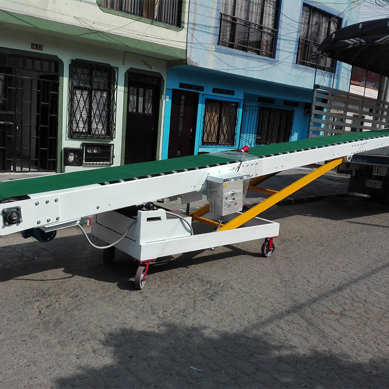 Transportadores Portatiles, Diseñados para cargar y descargar bultos, así como para arrumar en bodegas. Medidas desde los 3 mt de longitud hasta los 12 mt, con altura mínima de elevación de 2.20 mt hasta 7.50 mt de altura máxima. Ofrecemos sistema de elevación manual mediante malacate con freno automático y/o sistema de elevación motorizado.
